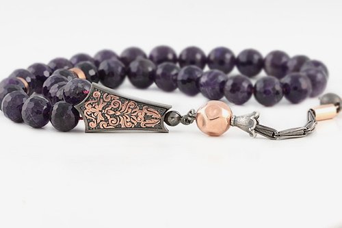 Made of 33 high-grade faceted amethyst beads, coloured, oxidized Sterling silver seperators, handle and tassel. Space between the beads is approximately 2-3 beads width. FREE handmade luxury gift box.
