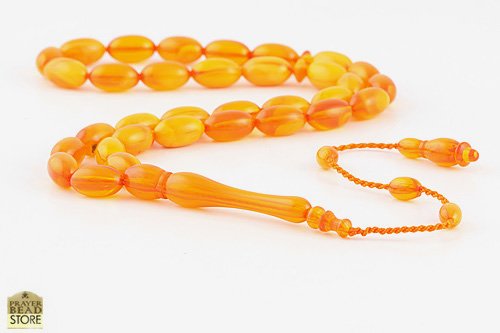Made of 33 orange amber bakelite beads, handle and tassel. Space between the beads is approximately 2-3 beads width. FREE handmade luxury gift box.