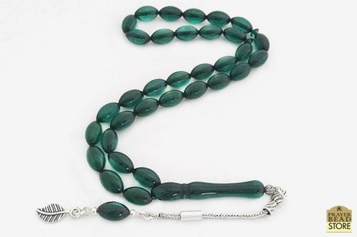 Made of 33 green amber bakelite beads, handle and 925k Sterling silver tassel. FREE handmade luxury gift box.