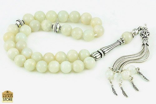 Made of 33 high-grade authentic moonstone beads, sterling silver beads, sterling silver handle and sterling silver tassel. Space between the beads is approximately 2-3 beads width. FREE handmade luxury gift box..