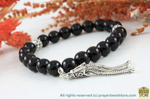 Made of high-grade authentic black onyx beads, sterling silver beads and sterling silver tassel. The beads are strung together with an elastic tie and this size fits most wrists. FREE handmade luxury gift box.