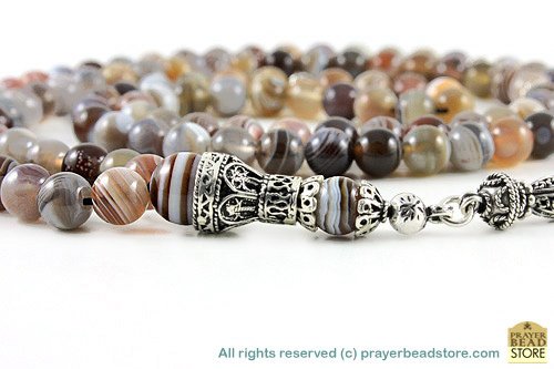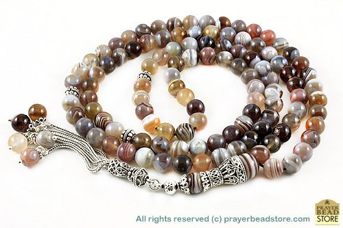 Made of 108 "high grade" authentic Botswana agate beads, Sterling silver seperators, handle and tassel. Free Shipping Worldwide, plus Free Handmade Luxury Gift Box.