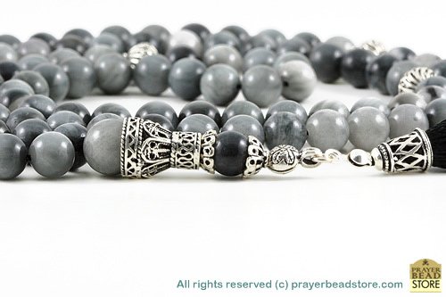 Made of 108 "high grade" authentic eagle eye agate beads, Sterling silver seperators, handle and natural cotton tassel. Free Shipping Worldwide, plus Free Handmade Luxury Gift Box.